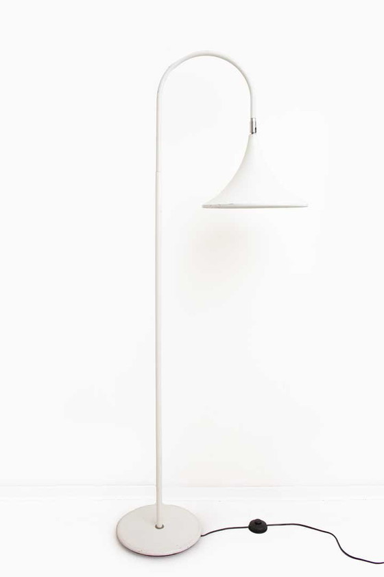 This 1980s floor lamp by Dutch brand Herda features a unique, trumpet-shaped design that is both functional and stylish. The lamp features a white metal base, a slim curved arm and a striking, trumpet-shaped shade. The clean lines and minimalist finish make this lamp a perfect addition to both retro and modern interiors.