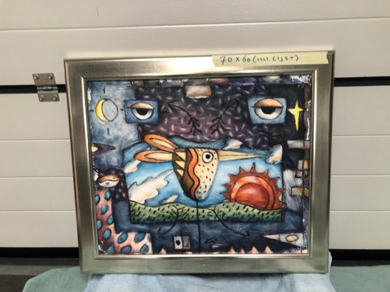 Shapes and colors have been Wim Heesakkers' lifelong guiding principles. His work emerges from a deeply personal experience and always expresses itself in a painting with a unique palette of shapes and colors. Thus, he has created a unique visual language. His subjects often touch on Romanticism, with a touch of humor as an underlying theme. We purchased eight paintings by Wim Heesakkers in 1999 from Art Angels. All eight paintings have a high-quality, matching frame and mounting. And, of course, signed by Wim Heesakkers. As the original owners, we enjoyed them every day for over 25 years. But we no longer have room for them in our new home. Therefore, we are now sadly saying goodbye to them. With an extremely attractive price for you. The other paintings are also listed on Whoppah. Painting(s) can only be picked up from the seller and are therefore not eligible for shipping.