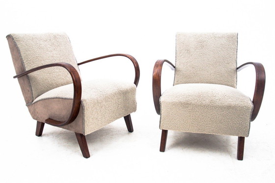 Iconic armchairs designed by J.Halabala in the Art Deco style, made around 1930. Seats and backrests upholstered with pleasant, beige bouclé fabric. The whole rests on straight legs, and the bent, wooden armrests add chic. Very comfortable armchairs, which, thanks to their timeless, minimalist form, will perfectly fit into contemporary interiors.