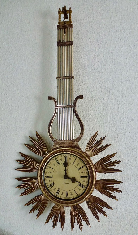 A vintage sundial with brass rays and a lyre-shaped pendulum.
