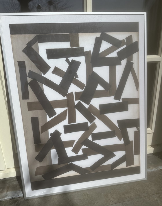 This work displays a dynamic composition of geometric shapes in rich brown and black tones against a bright white background.