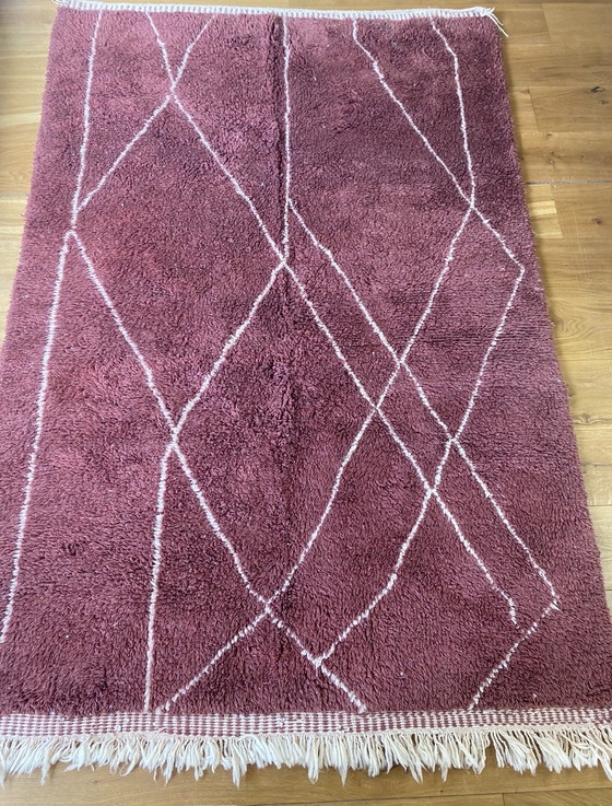 New and handmade in Morocco. A Berber rug in a unique color, made from very fine, densely knotted wool. Depending on the light, the color is reminiscent of Rioja/Bordeaux. One end has fringes, while the other, as is typical for traditional Beni Ourain rugs, has a woven edge. The minimalist, abstract line design gives the rug a modern look.