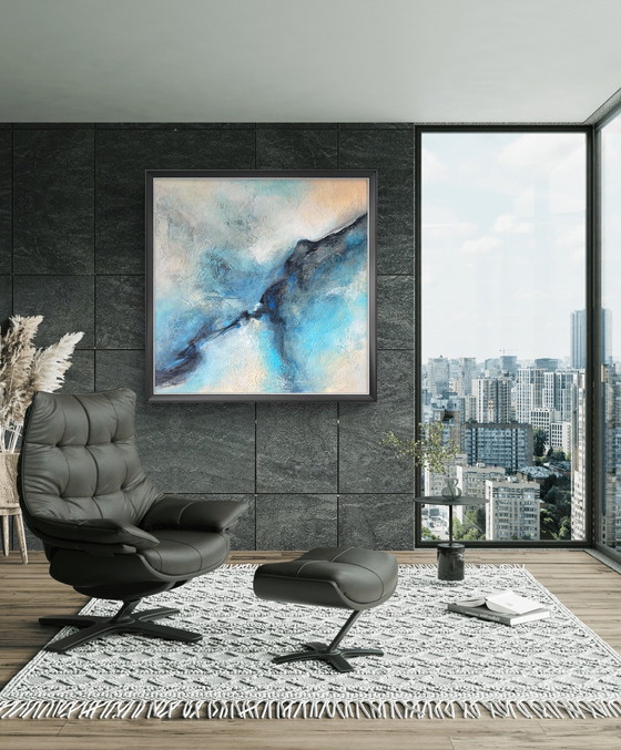 Layer by layer, like looking at the earth from above — turquoise, soft blues, beige and deep navy.