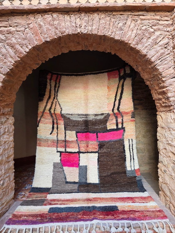 Step into a world of vibrant colors and intricate patterns with this stunning Moroccan Boujaad rug. Perfect for adding a splash of color to any room, this rug features a delightful mix of pink, brown, and beige tones, woven together in an abstract design that's both eye-catching and unique.