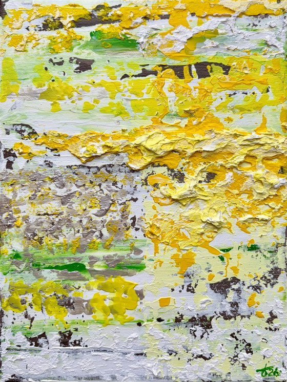 The painting is executed in acrylic on canvas and built up from multiple layers of paint, creating a rich texture. Bright lemon-yellow hues and soft green tones give the work a light, sunny appearance reminiscent of Mediterranean summers.