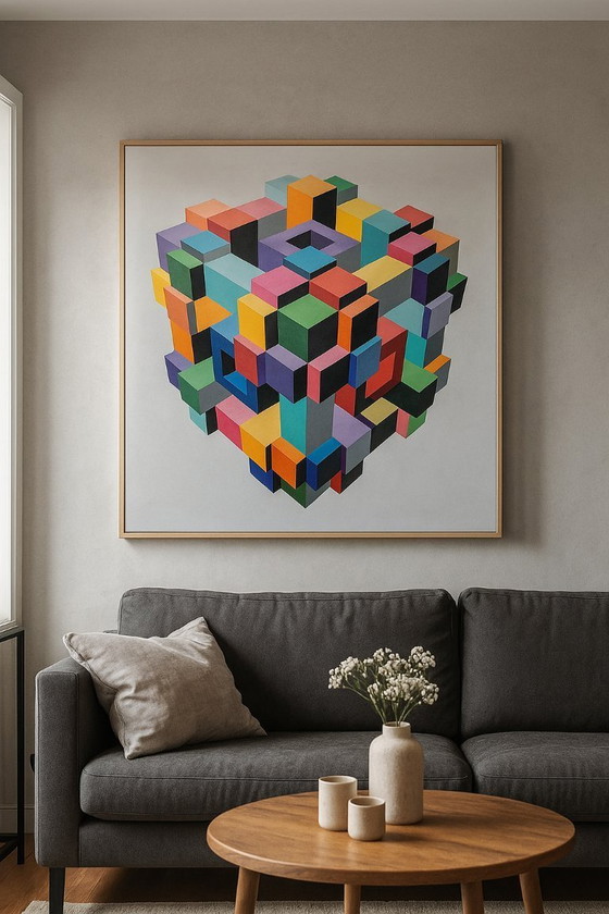 Art lovers beware! This powerful, geometric-abstract painting is a real eye-catcher. 'Accumulation' plays with perspective and illusion: a maze of colorful blocks that seem to float and interlock. The work is carefully hand-painted with acrylic paint on MDF, giving it a matte, deep look.