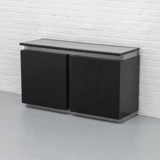 The cabinet is crafted from dark wood with brushed aluminium accents that highlight the edges and structure of the piece. The top sits slightly raised on the base, creating a layered effect that gives the whole an architectural character. Behind the two doors are glass shelves for practical storage space. A powerful and understated design in which the interplay of lines, materials, and proportions takes center stage. In good vintage condition with light signs of use.