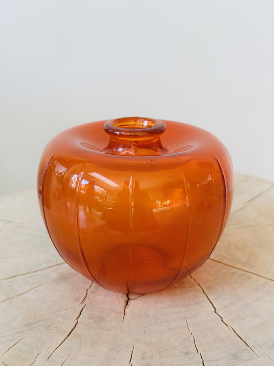 This is a highly sought-after model among collectors of Dutch glass design. The warm, deep orange color combined with the elegant spherical shape and 12 subtle vertical ribs gives the piece a timeless, almost sculptural appearance.