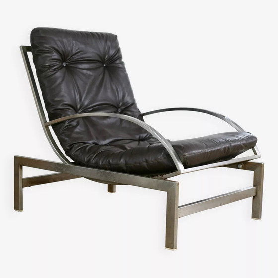 Dimensions: H92 x W68 x D95 Color: Brown Materials: Leather Style: Vintage Armchair by Guy Lefevre, France, 1970s. Leather. 6 positions. Solid, stable and comfortable. Significant corrosion marks on base (but solid structure), straps seem to have been replaced by a rope system (of no consequence), slightly different upholstery. See photos. 70's design.