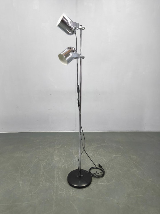This functionalist design features a slender chrome-plated structure with two adjustable spotlight heads, offering directional lighting with high versatility. The clean industrial aesthetic is enhanced by a minimalist lacquered base, creating a balanced and timeless silhouette.
