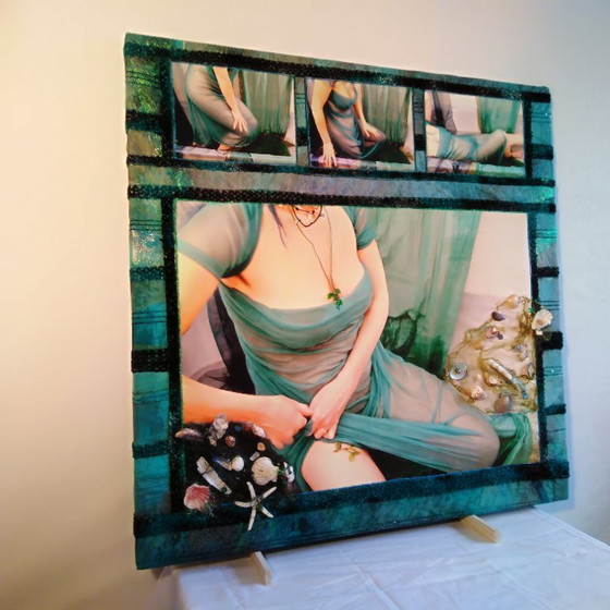 This modern painting, titled 'After the Bath', offers an intriguing glimpse into the art of contemporary expression. The work is a fusion of textiles and other materials, adding a unique texture and depth to the piece. The predominantly green and blue tones create a serene atmosphere, reminiscent of a Greek island.