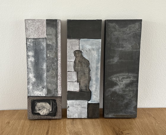 The panels are crafted using a complex mixed media technique. The use of various materials has created a robust relief reminiscent of weathered architectural elements. The combination of grey tones, abstract forms, and the human silhouette in the central panel creates an intriguing and timeless image.