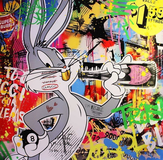In “Bugs in the System,” Aiiroh revisits the iconic Bugs Bunny character through a vibrant composition that blends humor, a critique of consumer society, and urban aesthetics. True to his style, he combines collage, painting, and typography in a dialogue between popular culture and advertising imagery.