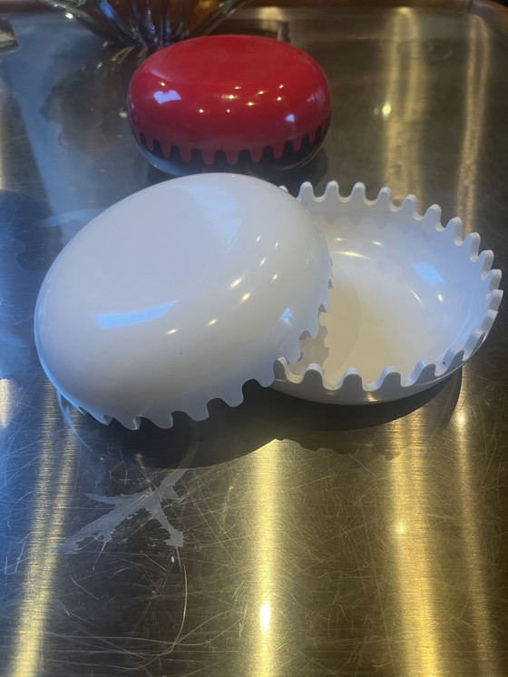 Discover the iconic "Clam" ashtray or container designed by Alan Fletcher for Mebel, a standout piece from the 1970s. Made in Italy, this unique item combines functionality with a striking design, perfect for adding a touch of vintage charm to any space. Its bold red and white color scheme makes it a versatile decorative object.