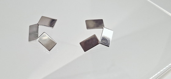 Alessi Fiato earring designed by Mario Trimarchi, 18/10 stainless steel. Geometric, contemporary, and architectural design. Composed of overlapping metal rectangles that create a sculptural effect.