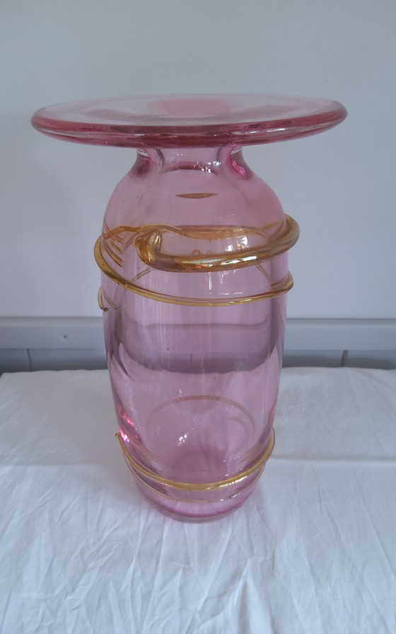 Discover the timeless elegance of this unique crystal vase, crafted by Alfred Collard at the renowned Val St Lambert in 1990. With its delicate pink hue and refined gold accents, this beautiful vase is a masterpiece of glassblowing art that adds a touch of luxury to any room.