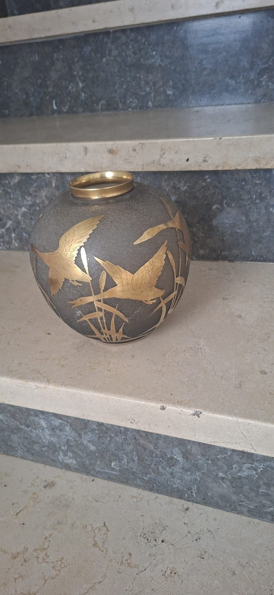 This exquisite vintage vase by Alfred Taube is a true masterpiece of glass etching. With an elegant design depicting wild geese in their natural habitat, this vase is a real eye-catcher. The golden accents on the gray glass lend the piece a luxurious touch, making it a perfect highlight for any stylish home.