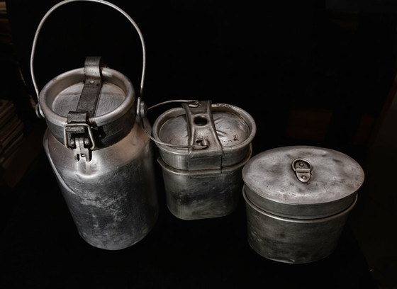 Timeless design from the past! For display, original pieces of historical equipment that have stood the test of time. From the soldier's mess tin to the farmer's milk can: aluminum objects, silent witnesses to life in an era. A piece of history. Perfect for collectors, reenactment enthusiasts, and lovers of industrial vintage. Consisting of an aluminum milk can with a hook closure, measuring 12 cm in diameter and 22 cm in height. A classic oval military mess tin composed of two interlocking sections. Made of aluminum. Measures 12 x 8 x 17 cm. A simple worker's mess tin with two interlocking sections, measures 12 x 8 x 14 cm. The pieces show signs of wear and dents, which lend them a vintage charm. All pieces date between 1910 and 1920.