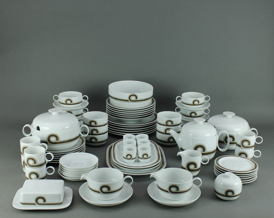 Complete porcelain service for 6 persons, designed in 1968 by Ambogio Pozzi with a decor of Rosemonde Nairac, marked. Design: Ambrogio Pozzi (1931-2012) Decor design: Rosemonde Nairac (1938) Model: Duo Baltic Manufacturer: Rosenthal Studio-Line, Germany Design year: 1968 Weight: 22 kg Condition: Intact and in good condition Number of objects: 73 - Teapot - 6 cups and saucers - Sugar bowl and milk jug - 6 breakfast plates - Butter dish - 6 egg cups - 6 cake plates - 6 dinner plates - 6 soup plates - 6 soup bowls with under saucers - 6 bowls - 2 saucers with under saucers - 2 covered dishes with lids - 1 large flat oval dish - 2 small flat oval dishes - 1 salad bowl