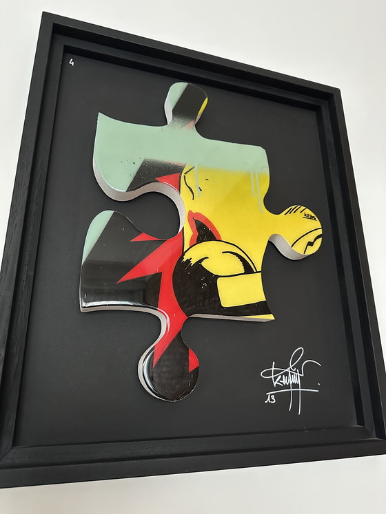 This piece, titled "La Rumeur" n° 4, is a signature 3D puzzle piece that perfectly captures Keymi's style of deconstructing pop culture icons. It features a masterful mash-up of Keith Haring’s figures, Roy Lichtenstein’s comic aesthetics, and David Bowie’s iconic Aladdin Sane bolt.