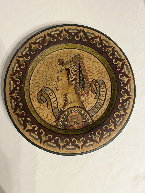 The plate is decorated with a profile portrait of a woman identified as "DIVA BEATRICE." This artwork was created by Leonardo for Etruria Montopoli. Diameter 41 cm, weight 2.8 kg. A collector's item and a unique work of Italian craftsmanship.