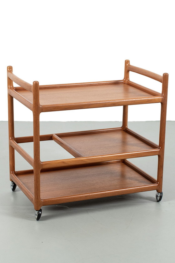 Andersen tea trolley for Silkeborg in teak. This piece was designed by Danish designer Johannes Andersen in the 1960s. This period (mid-century) is characterized by beautiful organic shapes and the craftsmanship and high-quality production. In good vintage condition.