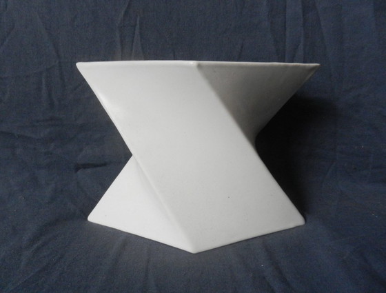 Fine vase of white glazed earthenware, turned a quarter turn in the rectangular base form. Manufactured by Jan van der Vaart (1931-2000). Signed on bottom with: vd Vaart, his wheel mark and 75 (before 1975). Dimensions: hxwxd: 14.1 x 19.8 x 10.3 cm. Condition: very good (minor chip or baking flaw? on corner point top edge, see photos).