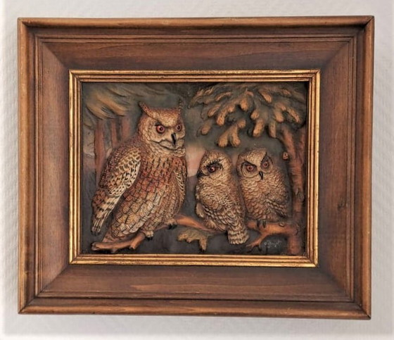 This artwork, featuring three owls by Carl Spitzweg, is a refined 3D relief, precision-carved from wood.