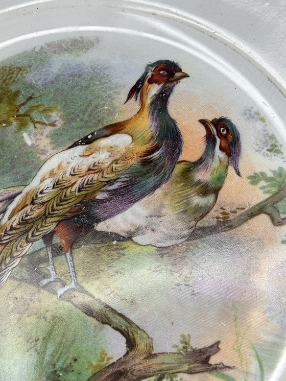 Step back in time with this exquisite antique pheasant plate from Société Céramique Maestricht, crafted around 1900. This piece captures the elegance of the Art Nouveau era with its vibrant depiction of pheasants, rendered in a palette of rich, multi-colored hues against a classic white porcelain backdrop.