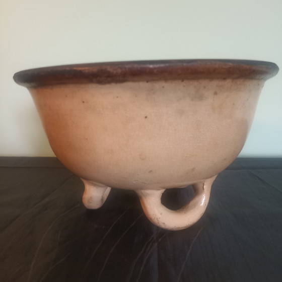 This rare piece of Art Populaire is an authentic find from the southwest of France. This "Oule" (bowl on three legs) dates from the late 18th century (c. 1780-1820) and is a beautiful example of rustic, artisanal pottery.