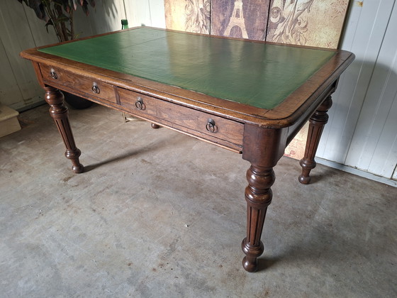 This beautiful antique partners' desk offers timeless elegance that will enhance any space. With its rich wood finish and refined leather inlay, this desk is not only a functional piece of furniture but also a statement of classic style.