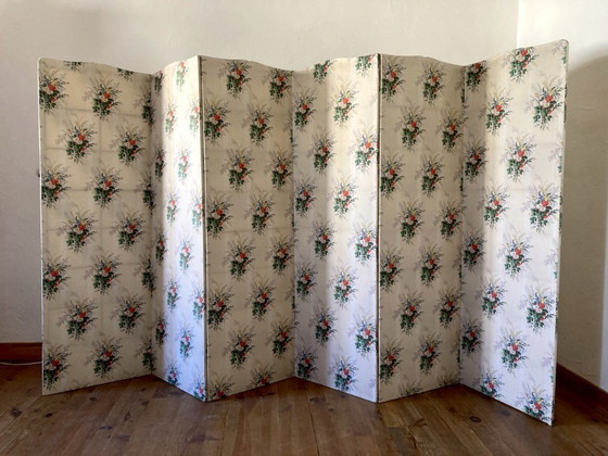 Antique 6-panel/3-panel fabric screen mounted on a double-sided wooden frame. 1950s-1960s.