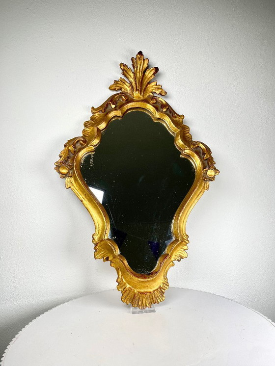 A beautiful antique style vintage mirror with a decorative Italian Baroque / Rococo design. The gilded wooden frame has detailed, ornate scrollwork and classic floral motifs. Presumably from early 20th century.