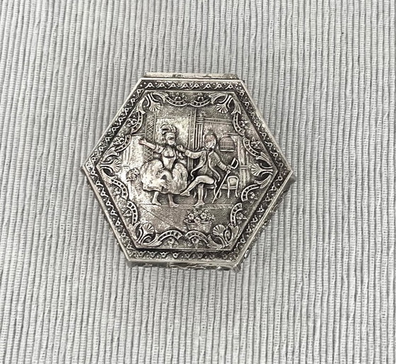 This is a heavy, silver-plated box, hexagonal in shape, with beautiful relief decorations on all sides.