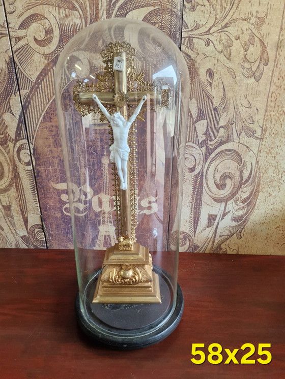 This beautiful antique bell jar with crucifix is an impressive piece that adds a touch of historical elegance to your interior. Carefully crafted with detailed metalwork, the crucifix is protected by a glass bell jar that preserves both the beauty and integrity of the piece.