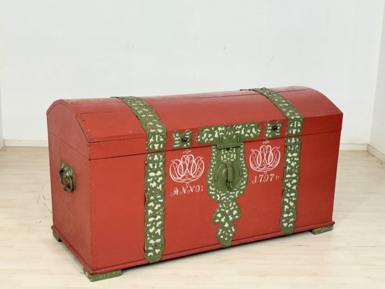This magnificent chest is an authentic piece of its era and captivates with its characteristic, rustic painted finish (as seen in the pictures). It is crafted from solid reclaimed wood, giving it not only unparalleled charm but also considerable weight and durability. A true collector's item.