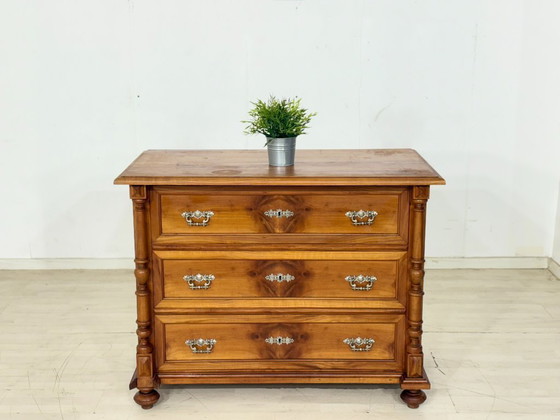 For sale is a charming antique chest of drawers dating from around 1880. This piece of furniture impresses with its high-quality craftsmanship, the classic design of the Gründerzeit period, and the elegant walnut wood finish. Particularly noteworthy are the beautifully mirrored grain on the drawer fronts and the warm, deep color of the wood.