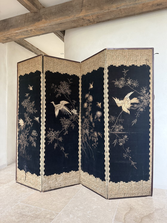 Beautiful antique Chinese chinoiserie room divider (circa 1885) with black velvet panels and refined gold embroidery of birds and flowers. Wooden frame with a silk backing. Beautifully weathered character with an authentic look.