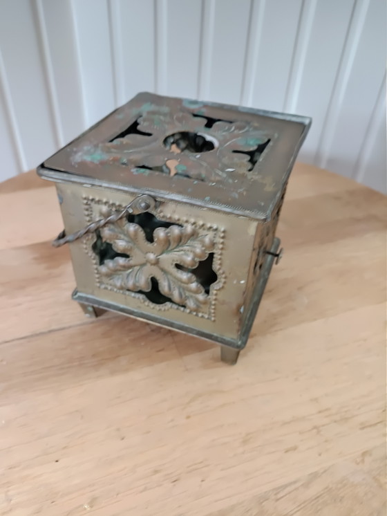 Charming antique hot holder made of copper/brass with perforated floral motifs. Originally used to keep tea or coffee hot with a small petroleum reservoir (still present).
