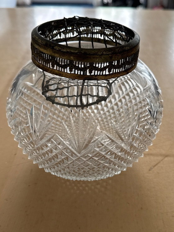 Beautiful antique crystal rose vase with a finely cut pattern. The vase exudes elegance and is perfect for displaying roses or other flowers. The metal grid on top is slightly discolored, but the vase itself is undamaged and in excellent condition.