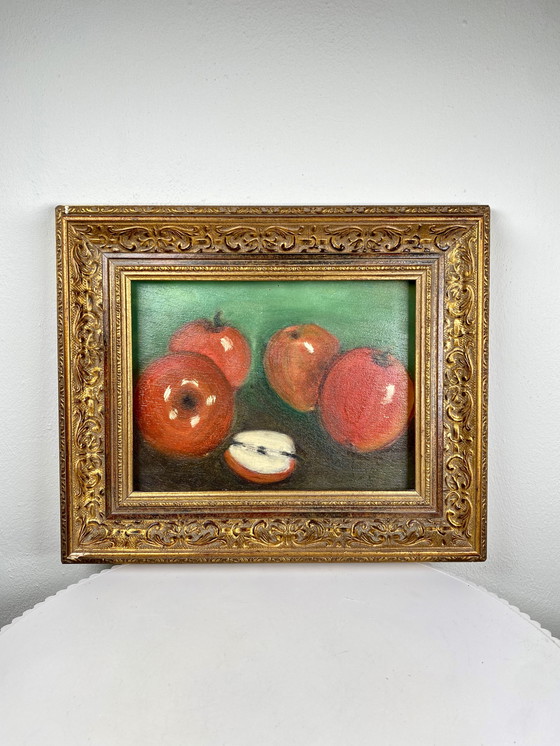 A traditional vintage oil painting depicting a classic still life scene of red apples on a green background from 1986. The painting is set in a beautiful golden Italian-style frame. The painting is signed on the back, but the signature is unclear—possibly "Bleekes." It is also dated "1986, Amsterdam" on the reverse.