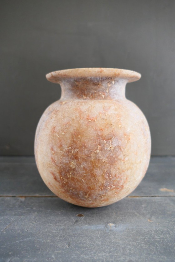 This antique Egyptian alabaster vase is a real eye-catcher with its beautiful natural tones and subtle shimmer. Imagine how this vase adds a touch of elegance to your interior, whether it sits on a side table or as a centerpiece on your dining table.