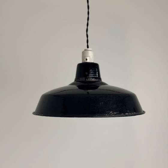Vintage industrial pendant light. Made of black enameled sheet metal. Circa 1950. In good condition. Note some enamel chips and traces of rust.