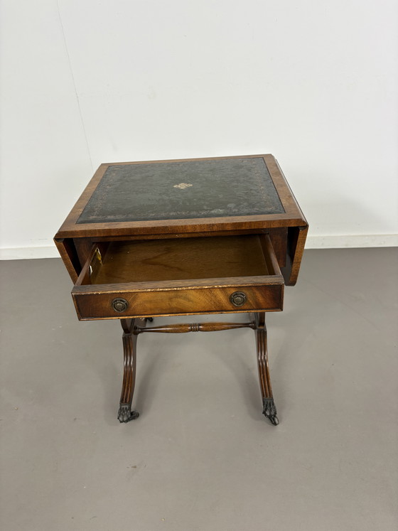 This beautiful antique English side table by Bevan Funnell from the 1920s exudes a timeless elegance that will enrich your interior. The tabletop is finished with a refined leather inlay, surrounded by a stunning wooden frame that emphasizes the classic charm of this piece. The graceful legs terminate in detailed claw feet, contributing to the authentic appearance of the furniture.