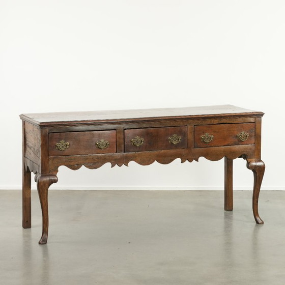 This sideboard is a true showpiece for any lover of genuine antique items! Dating from the 18th century, this item fits easily into both classic and modern interiors. Made of oak, it features three drawers, offering you ample storage space. The drawers are fitted with stylish gold-colored handles that add a touch of elegance. Through years of responsible use, it has acquired normal signs of wear, which contributes to its beautiful patina. Structurally, it is in good and immediately usable condition, and with proper use, you will enjoy this item for many years to come! Where will you place this eye-catcher?