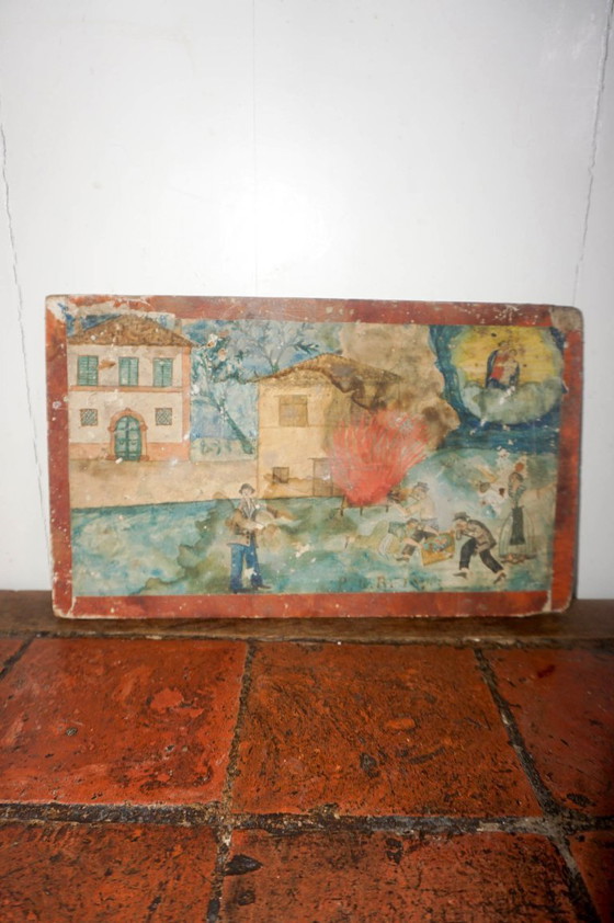 tags: ex voto, fire rescue painting, 19th century art, italian folk art, oil on wood, devotional painting, outsider art, catholic votive, primitive art, antique religious, vernacular art, historic wall art, catholic christian gift