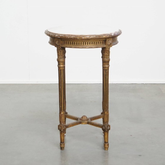 Offered this antique French round gold brocante side table with a marble top.