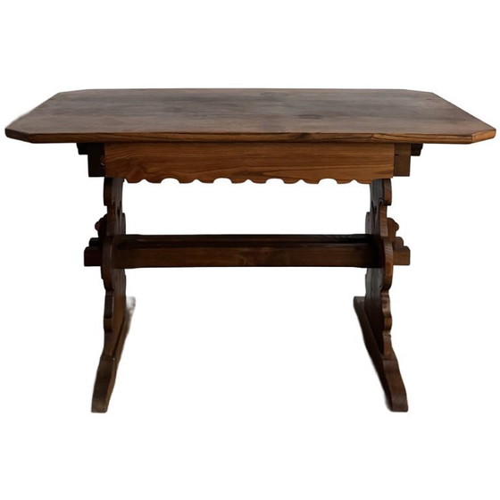 Probably German or Alpine, dating from the early 1900s to the mid-20th century. The table is in excellent vintage condition, sturdy, and has a warm tone with a functional drawer. Perfect as a desk, entryway table, or small dining table.