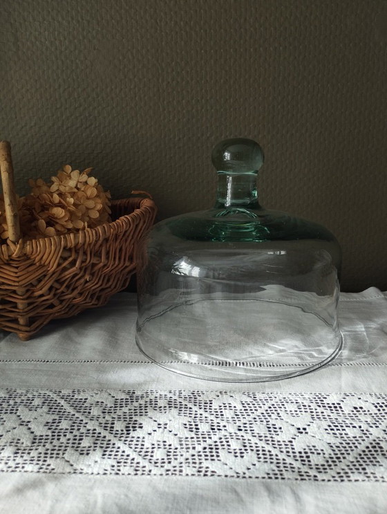 Charming decorative glass dome, suitable for cheese or desserts, made of thick, slightly green-tinted blown glass, with an oblong handle/knob.