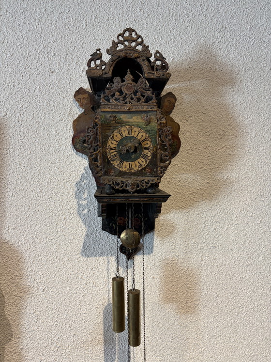 This beautiful antique small mantel clock is a true work of art that brings a touch of history and elegance to your interior. With its detailed movement and mermaids painted on either side, this clock is a unique eye-catcher.